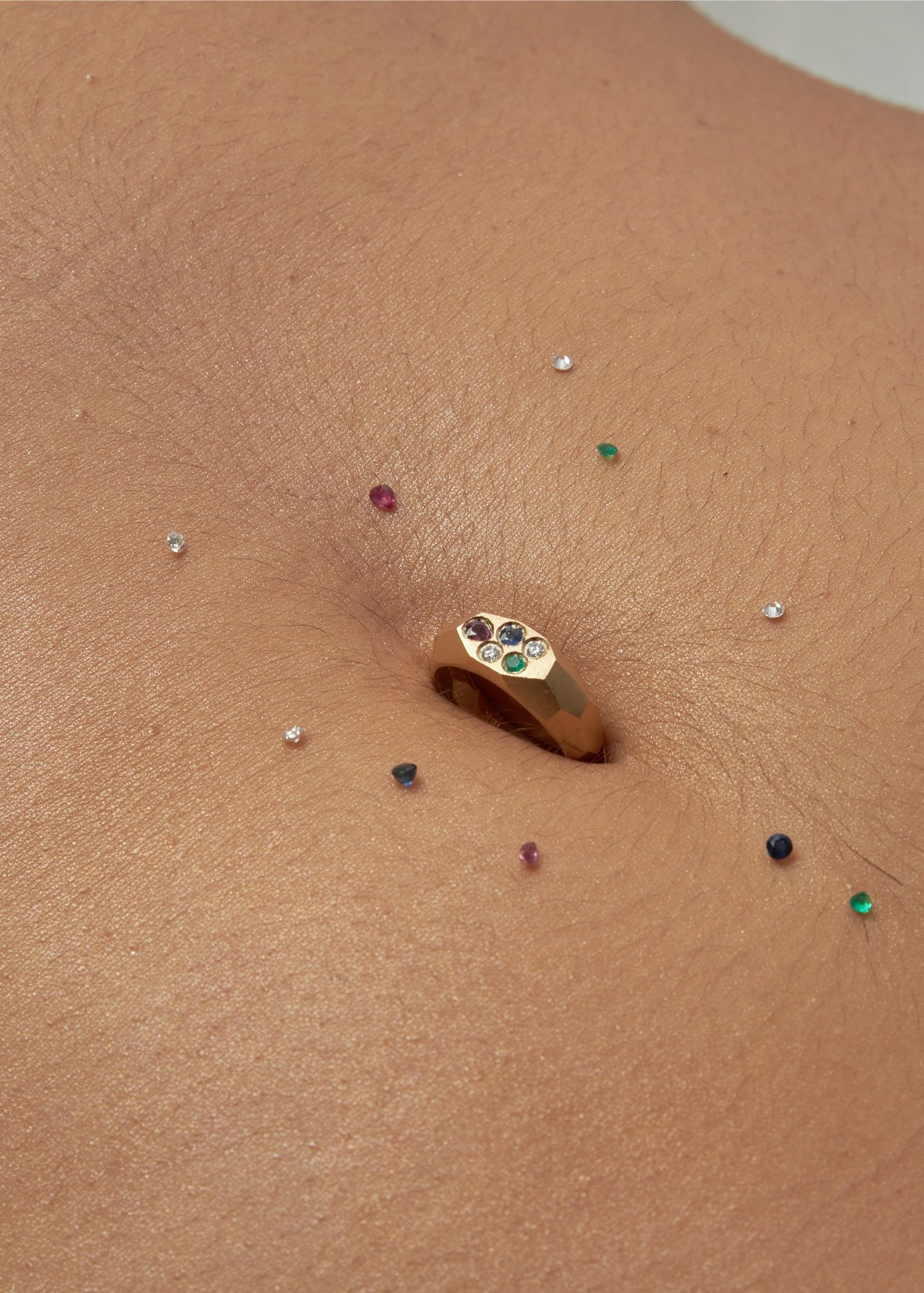 Una esmeralda, un zafiro, un rubí y dos diamantes contemplan el equilibrio perfecto de los cuatro elementos de la naturaleza. Engastados en un aro de oro de 18k que evoca la perfecta geometría y te invita a vivir la vida