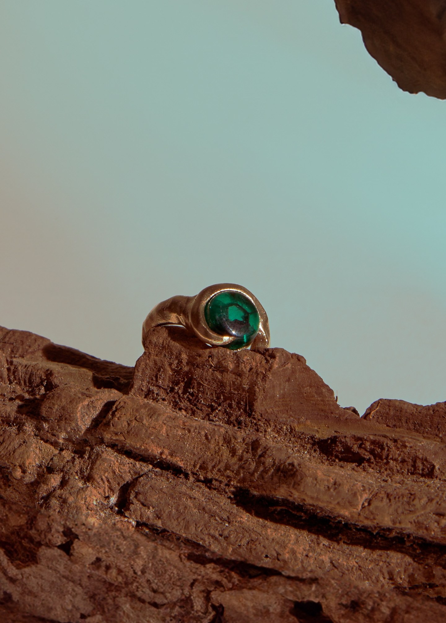 La esmeralda trapiche, piedra propia de Muzo, Colombia, es un tributo a todo aquello que representa una conexión con la tierra, la estabilidad y armonía. Engastada sobre un aro con textura orgánica característica de Sara & Flora. Esta pieza celebra el carácter, la fuerza y la resiliencia del ser.