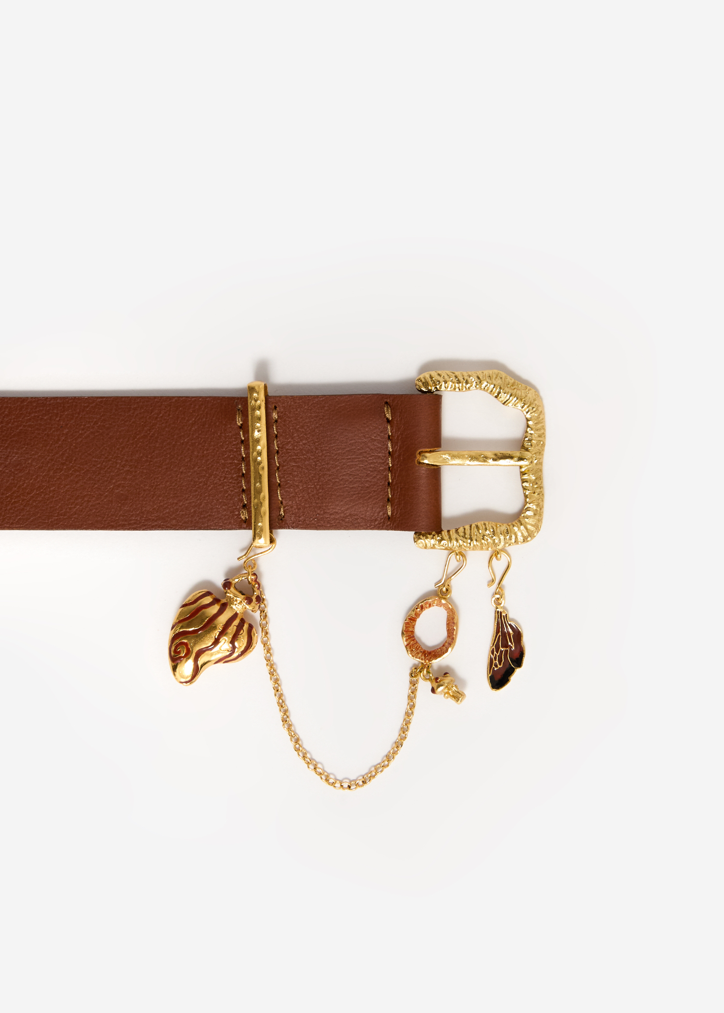Cinturón de cuero hecho a mano con hebilla escultórica en bronce bañada en oro de 24k. Diseñado para usarlo con charms cuando quieras looks más elevados o sin ellos para un estilo más casual. Puede llevarse en la cintura o la cadera y permite hacer un nudo con el cuero para ajustarlo a tu gusto.